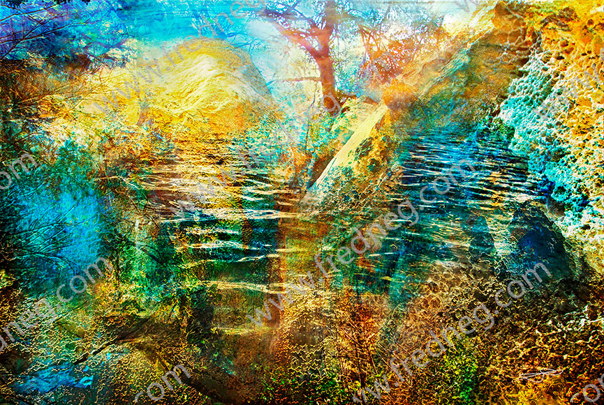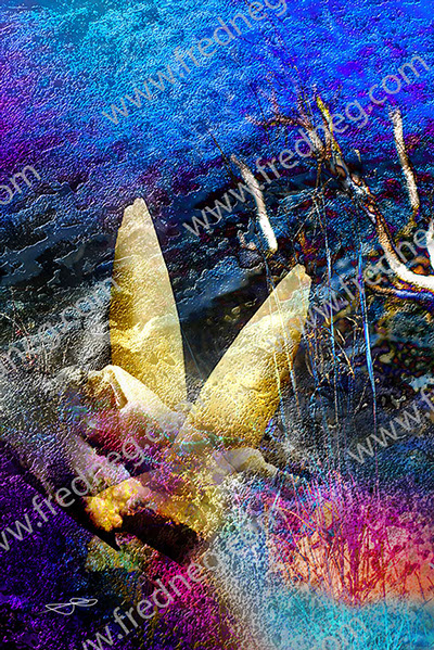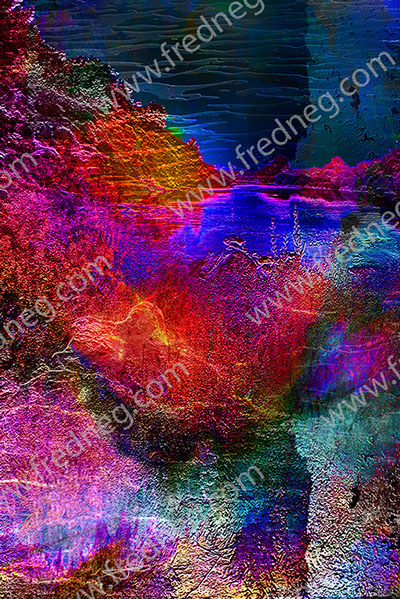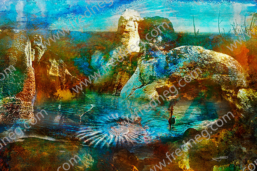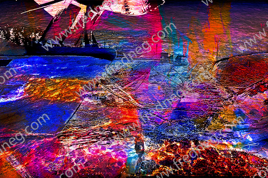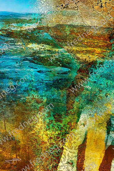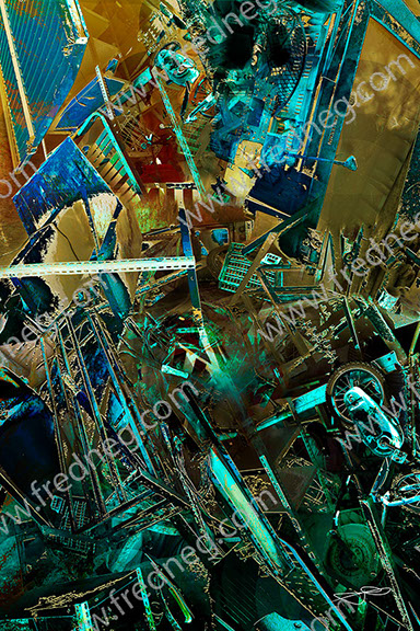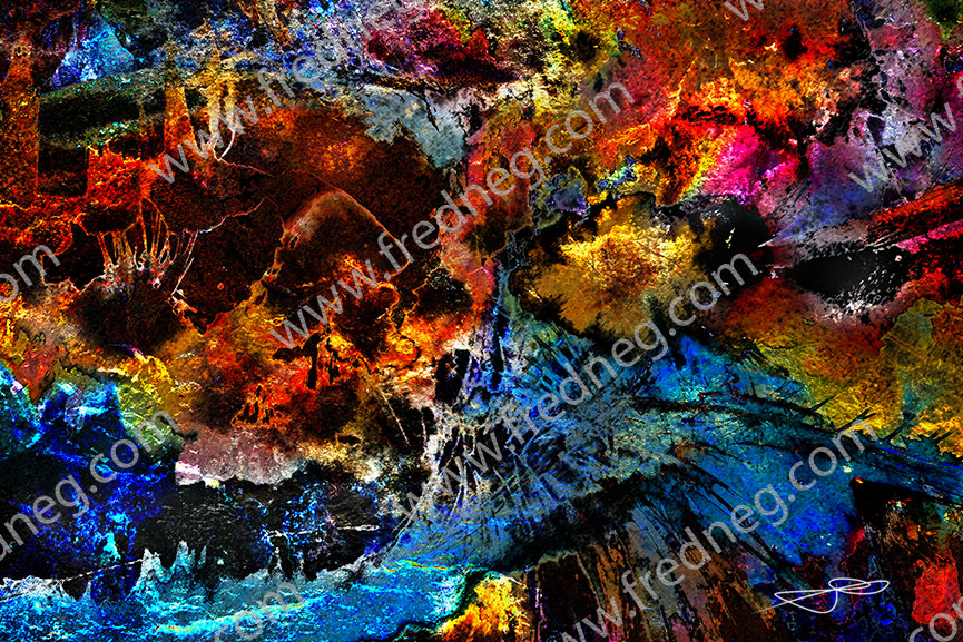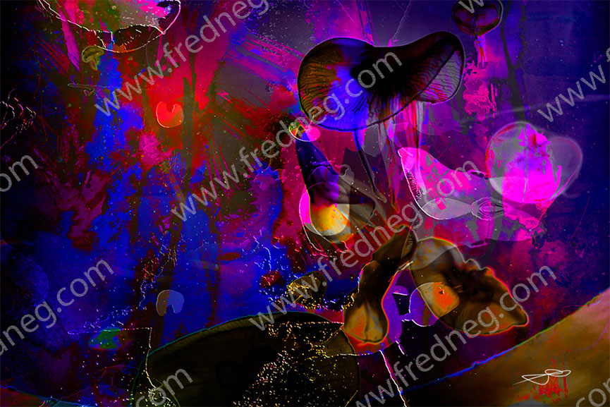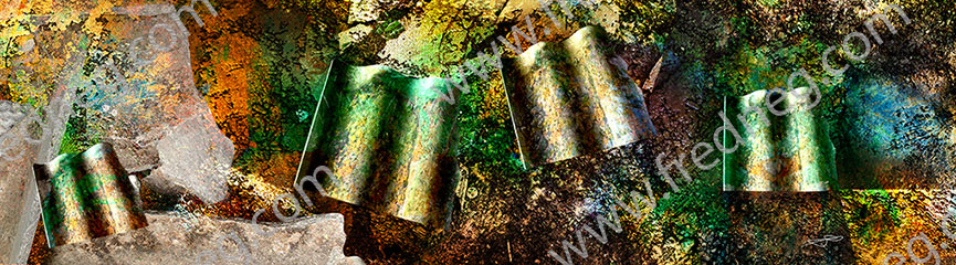 Through those digital paintings, I wanted to express the power of the atomic reaction hidden behind an apparent inertia. The energy released from the natural elementary strengths at each moment of change free from human interference in order to reveal a kind of scintillating beauty made of a thousand sparks and gold powder particles.